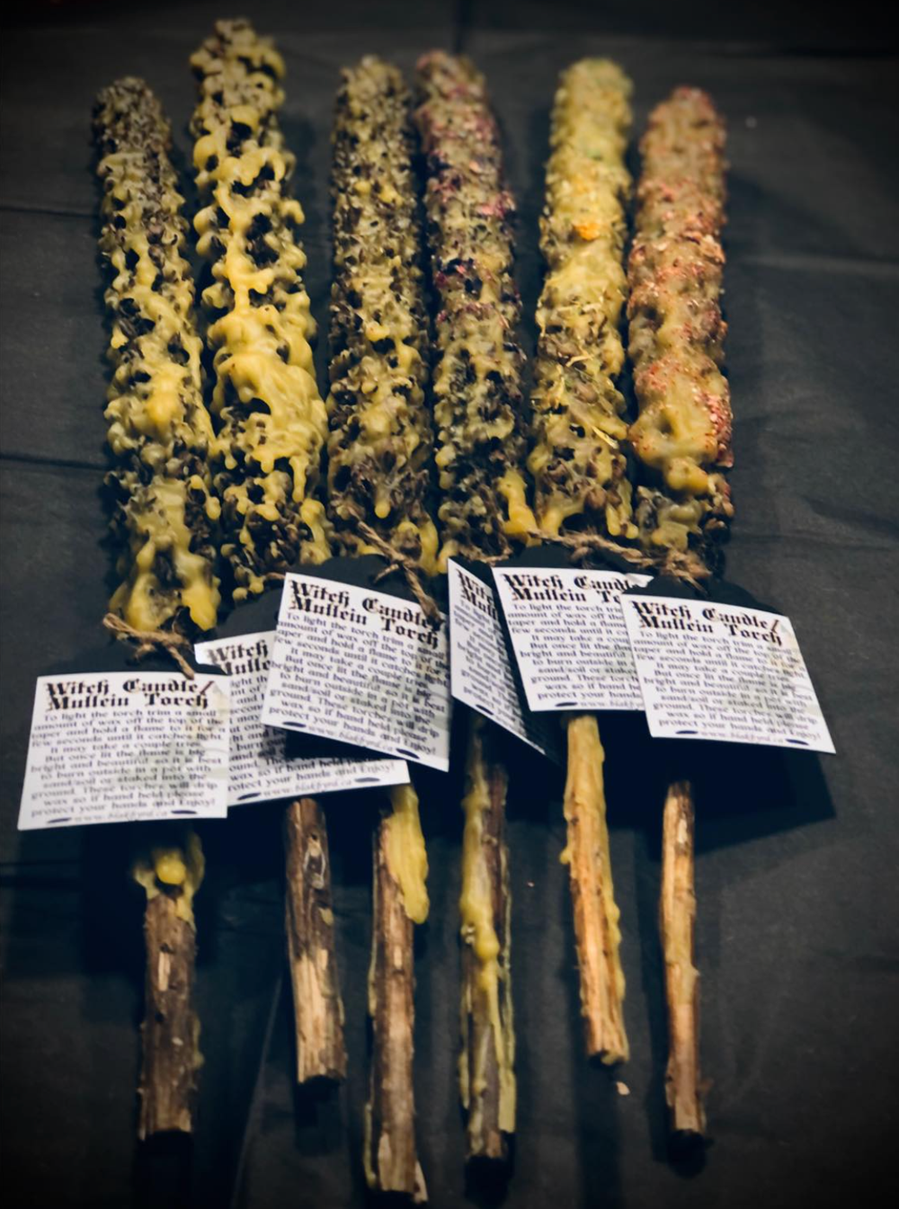 Throughout history, humanity has long embraced the tradition of crafting torches by immersing dried mullein stalks in beeswax. These luminaries have served as sources of light and bolstered various rituals, ceremonies, and spiritual purifications. Known by a myriad of names such as Mullein Torch, Hags Taper, Witches Candle, Jupiters Rod...these torches hold profound significance. Mullein is ruled by Saturn and mostly associated with the element of fire. She is the herb of protection, as well as protect you while going through traumatic events. She can help to bring clarity in situations you are unsure of. Mullein teaches us strength in vulnerability and is a wonderful ally to help emotions to move again. These mullein candles were all wild harvested and made with local beeswax. These candles are perfect for rituals concerning... - Protection (of any kind) - Purification - Clarity - Connecting with ancestors - Celebrations of any kind *sizes vary