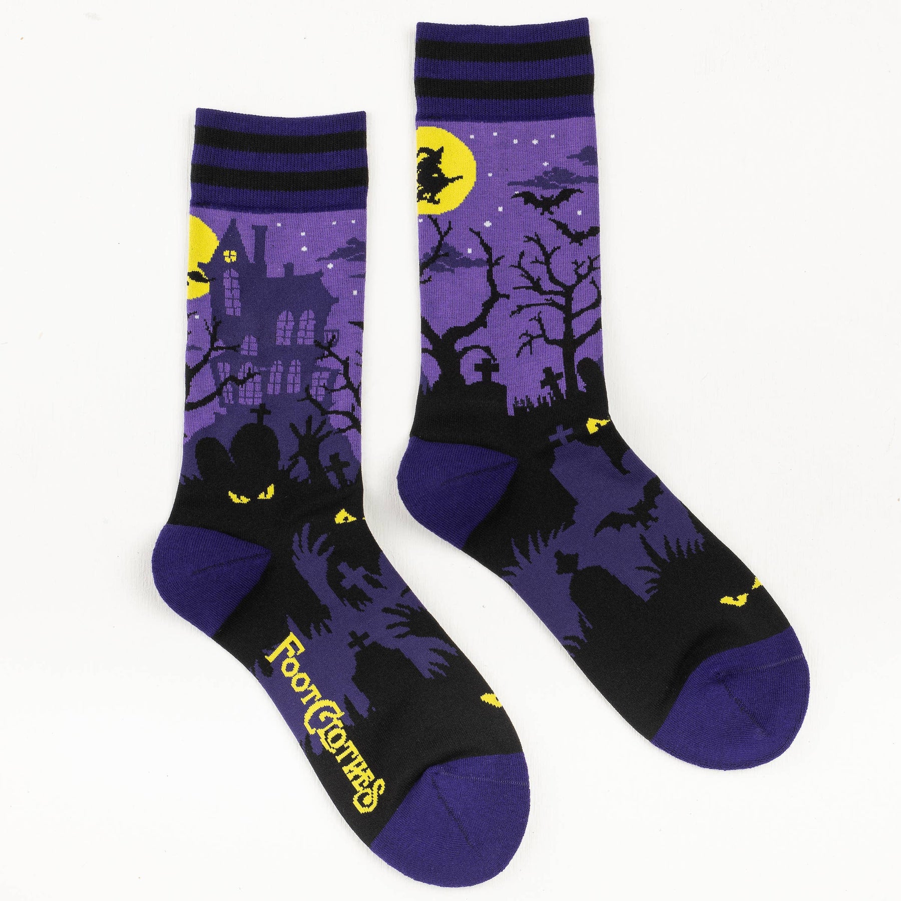 The difference between a real haunted house and these socks is that if you spend the night in these socks, you'll probably just wake up comfortable instead of, ya know, maybe dead. ------- Sock Specs: * Combed Cotton/Nylon/Spandex for breathability, durability, and stretch * DOUBLE TERRY in the heel and toe area adds durability and comfort where most novelty sock brands fail. * 200N Thread Count for highest level of detail * 40 Gram Socks with smooth seams * No uncomfortable bumps in the toe area One Size Fits Most Humans Size 5-13